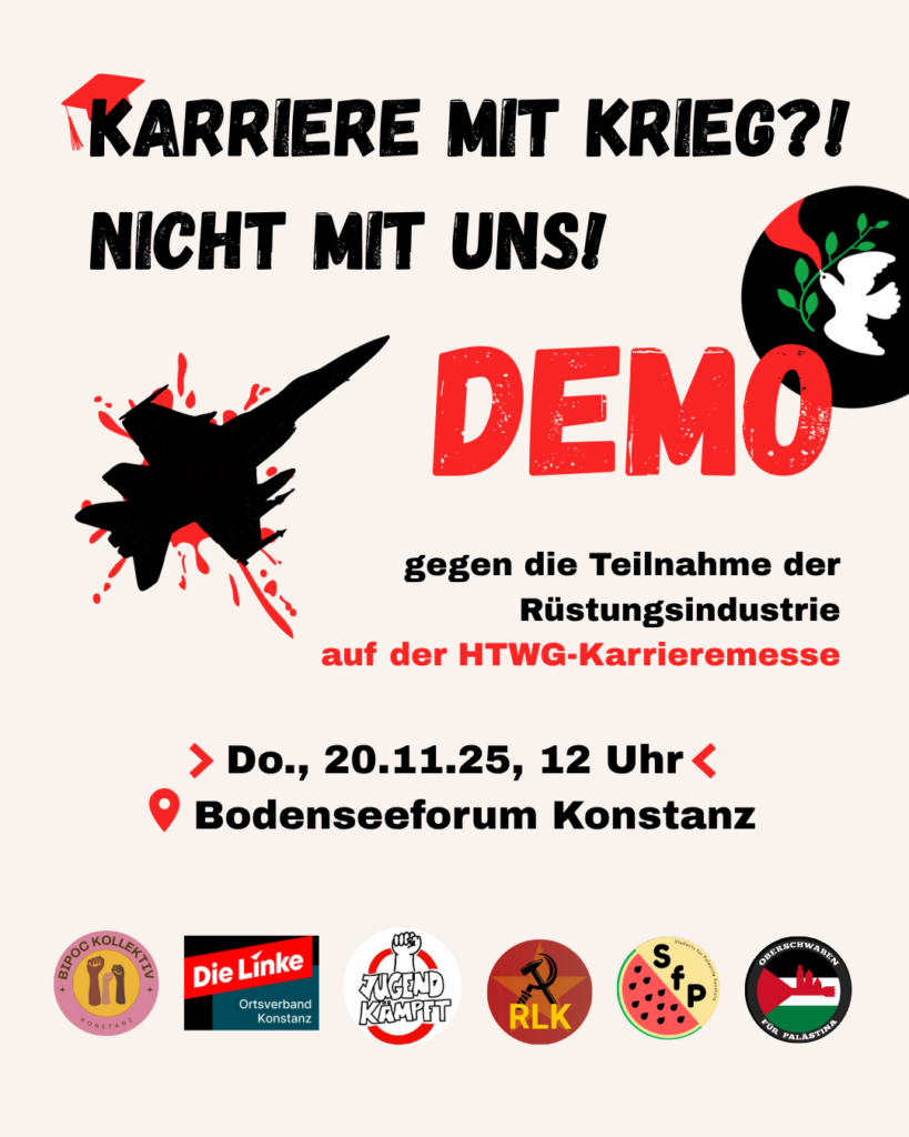 📣 DEMO on the 20.11.25, 12pm near Bodenseeforum Konstanz: Against Cooperation between HTWG and the weapons industry, esp. with genocide suppliers like Diehl Defense and Elbit Systems.